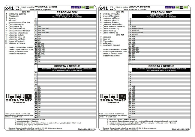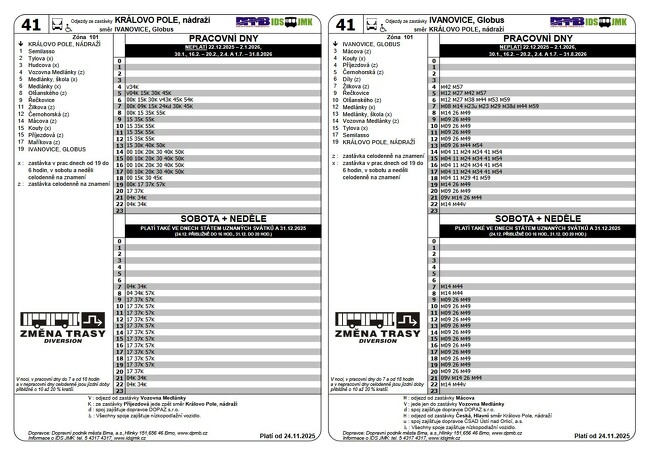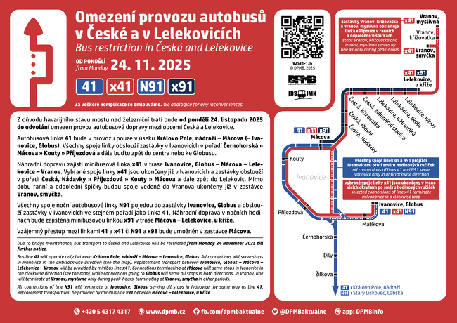 Do České a Lelekovic budou jezdit pouze minibusy linka X41 a přestupy budou na zastávkách Mácova. V úseku Královo Pole, nádraží - Mácova bude provoz autobusu 41 bez omezení.